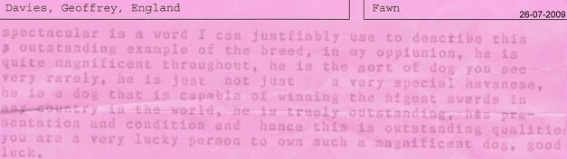 pragtfuld. Det er så sjældent man får lov at opleve det. Han er ikke blot en ekstraspeciel Havaneser men han er også en hund som er i stand til at vinde de højeste præmier i hvilken som helst land i verden Han er virkelig enestående; hans præsentation og hans forfatning, disse er hans fremtrædende egenskaber. Du er meget heldig at være i besiddelse af sådan en pragtfuld hund Held og lykke. |