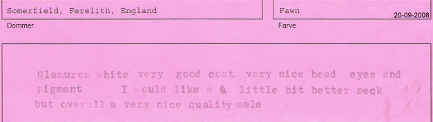 | Glamourøs hvid flot pels, meget dejlig hovede, øjne og pigment. Jeg kunne ønske lidt mere hals. Men over det hele en rigtig pæn kvalitets han. |