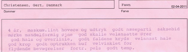 | Godt opdrættet hund - god baghovede og hals - godt vinklet - sund ryglinje og haleføring - godt hovede og udtryk. Bidet kunne være lidt bedre. Bevæger sig godt bagtil - pæn i front - viser sig godt, gode fremadgribende bevægelser, ryglinjen er stabil i bevægelse - flot pels. |