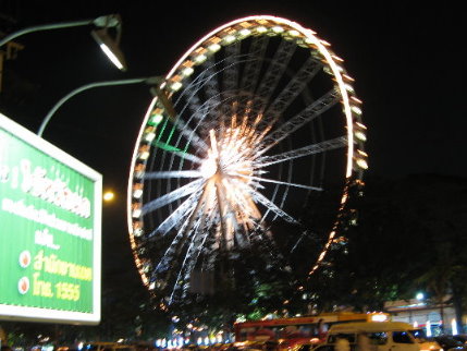 Pariserhjulet var i en periode opsat i nærheden af Patpong, jeg er ellers ikke så glad for den slags forlystelser, men denne her måtte vi altså prøve. Det kostede 5 kr. for 10-15 minutter. Da vi nåede toppen stoppede pariserhjulet, og jeg syntes vi sad deroppe i meget lang tid. Nr. 2 billede er taget da vi ca. var halvvejs oppe, og allerede der syntes jeg at der var langt ned. Billederne helt oppe fra toppen duede ikke, men de mennesker som står nedenfor var bittesmå da vi nåede helt op.